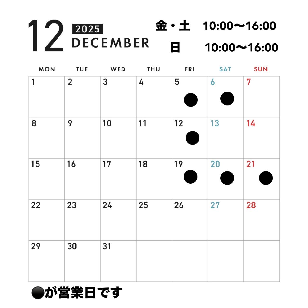 12月の営業日はカレンダーでお確かめください。 12月より日曜営業の時間を10:00〜に変更させて頂きます。よろしくお願いいたします。 |